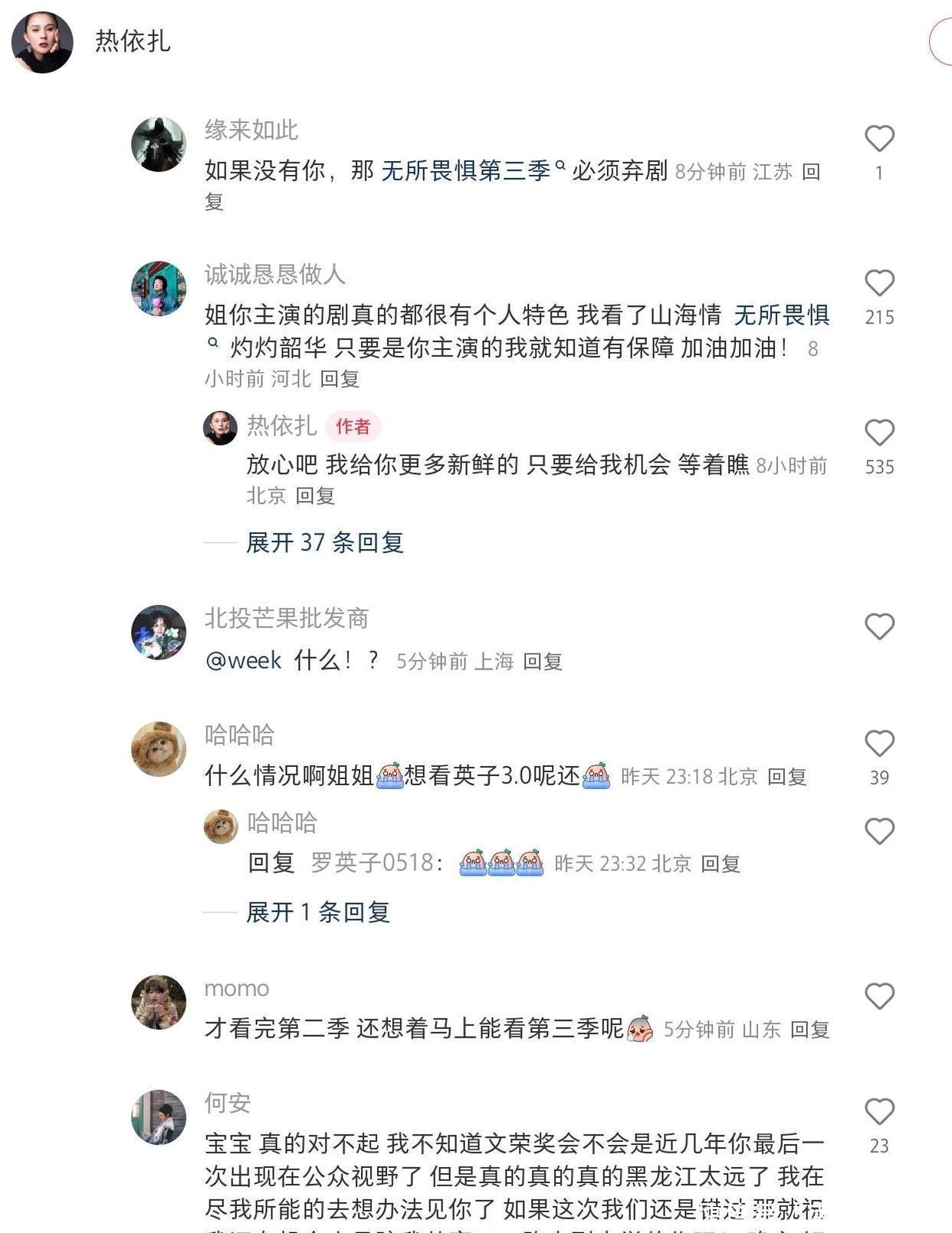 评论区里,许多网友都说自己挺不舍的,觉得之前两部作品都挺精彩的,而且热依扎主演的剧都挺有自己特色,实在不舍得热依扎姐姐就这么退出。大家都在盼着她的新作品早日出来。