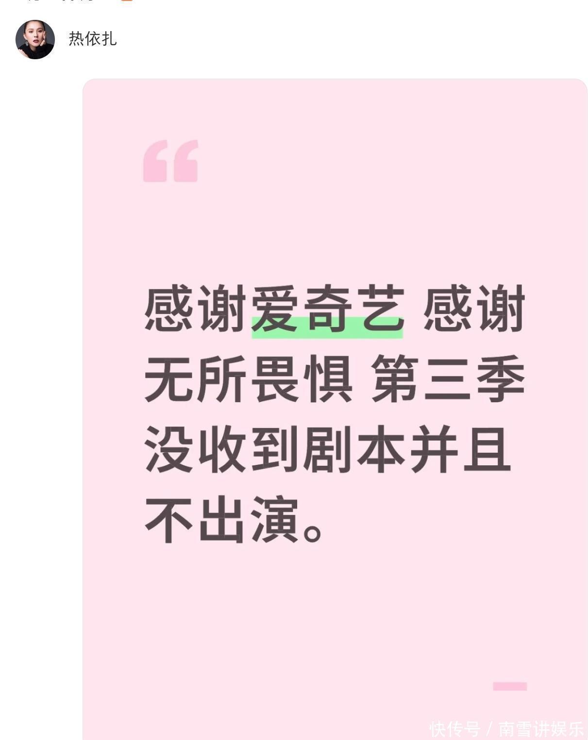 和通常的正式声明不一样,这次热依扎在发声中明显带着点儿委屈。她提到要感谢平台、感谢这个剧,但第三季不仅没有收到任何剧本,而且自己也已经确定不再出演了。