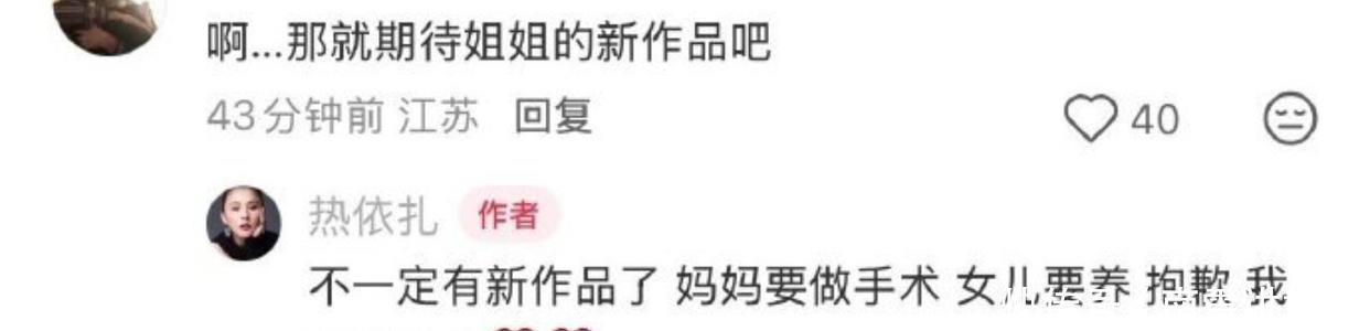 看到网友们都在支持热依扎,她也第一时间做出了回应,可惜内容有点触动心弦。热依扎坦言可能还没新作品了,原因是妈妈需要做手术,她还得照顾女儿,非常抱歉,已尽全力了。