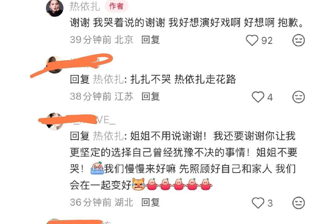 不过,后来热依扎回了网友的评论,怎么看怎么觉得哪里怪怪的。她一边跟网友说自己打算退出,一边又说“好想演戏”,还感谢大家的支持,强调“自己真的尽力了”。