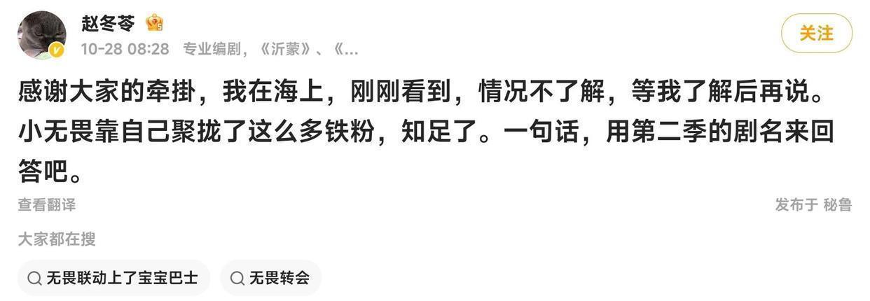 就在大家为此感到难过的时候,《无所畏惧》的编剧赵冬苓突然在微博发声,提到里面可能有些变动,让大家别急着下结论,稍微冷静一下。据了解,事情的缘由是热依扎在自己账号上突然高调宣布,自己将不再出演备受关注的《无所畏惧》第三部。